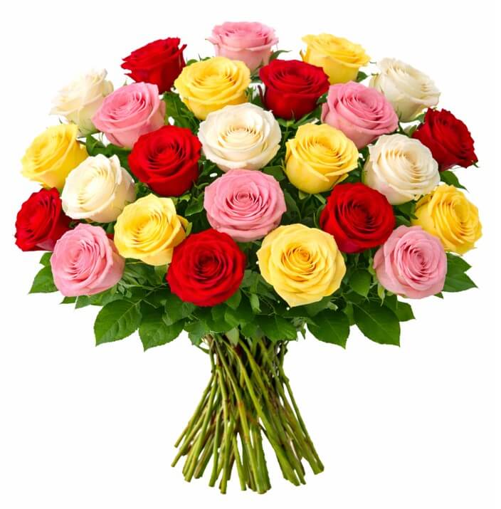 21 long stem roses 2 to 4 (40 - 50 cm), mixed colors - may be combination of red, white, pink, orange, yellow (bouquet may be composed of 2 colors, 3 colors, or 4 colors, according to availability - The bouquet presentation may differ from the image)