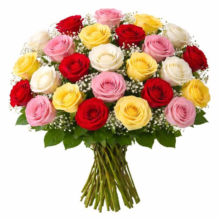 21 roses à longue tige 2 à 4 couleurs mélangées - peut être une combinaison de rouge, blanc, rose, orange, jaune (le bouquet peut être composé de 2 couleurs, 3 couleurs ou 4 couleurs, selon la disponibilité)